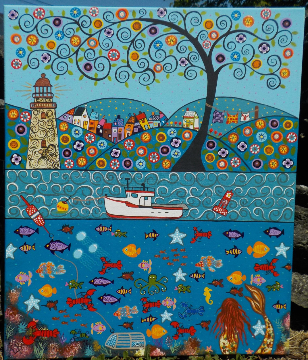 I was commissioned to paint this for a local Lobster Fisherman by his wife for Father's Day. I put 7 Red lobsters and 4 that are slightly hidden to represent their 4 beautiful daughters. The copper in the mermaid's hair is fashioned after the fisherman's wife. I used the top of the lighthouse from the movie filmed in Yarmouth in 2018 "The Lighthouse" and as a tribute to Maud Lewis I added a Maud house. Hope this brings you many hours of enjoyment.