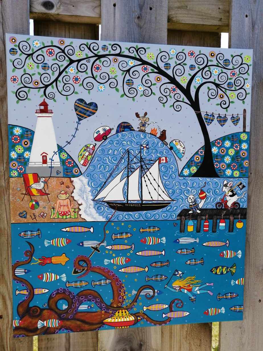 Nova Scotia and a personalized bag made for me by my friend Lana Shupe (The Little Old Bag Lady LANA). The hand-stitched tartan hearts sewn on my bag inspired me to paint many in my painting, with a few hidden throughout. I painted the Sandy Point Lighthouse, located in Shelburne Co., overlooking one of our many beaches. I then painted the Bluenose Schooner of Lunenburg anchored in a harbour, visiting one of many places this summer as it celebrates its 100th Anniversary. I wanted to highlight the 1967 Shag Harbour UFO sighting which was witnessed by many as it went into the ocean. I was 10 years old when this took place so I painted a UFO tangled up in a giant octopus, my theory of why the UFO was never seen again. I then painted in a rat and motorcycle to honour the Wharf Rat Rally, which began in 2005, in the small town of Digby. In 2017 alone, over 20,000 people attended this event. How many tartan items can you find in my Summer painting?
