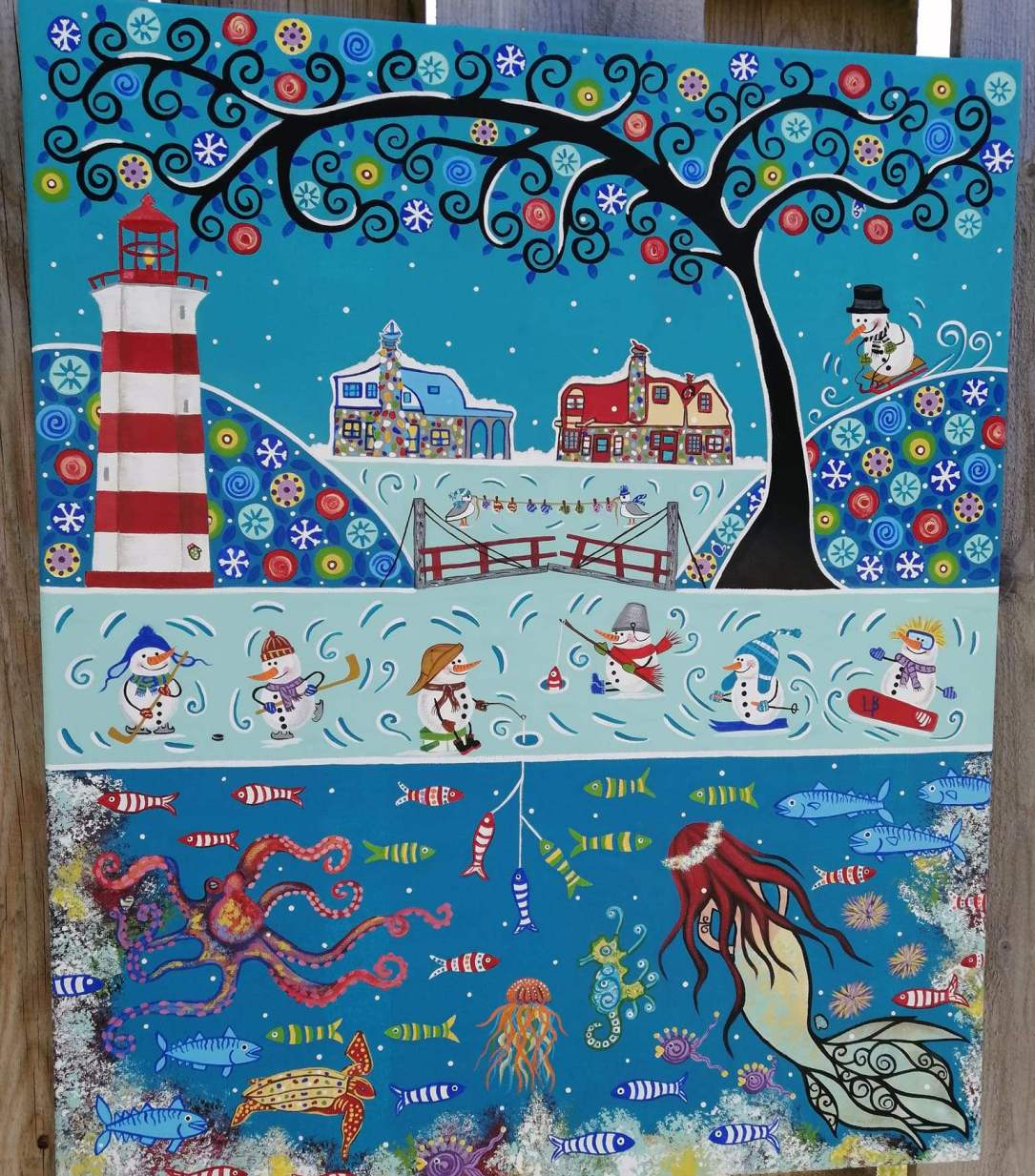 "I Love Nova Scotia Winter" is the 8th in my Nova Scotia series. I wanted to represent Winter in this painting like I had previously with my "I Love Nova Scotia Spring, Summer and Fall" works. I painted Snowmen playing Hockey, Ice Fishing and a few other outdoor activities that we enjoy here in Nova Scotia. There are lots of mittens in this winter painting, with some hidden for you to find. I love sharing Nova Scotia's history in my art, so I painted the oldest surviving lighthouse in Canada, the Sambro Island lighthouse, built in 1758, which stands at the entrance of Halifax Harbour. I painted a couple of the "Concrete Fairy Cottages" of Huntington Point, which are near Halls Harbour on the Bay of Fundy. There were five cottages built between 1934 and 1938 by Charles Macdonald to make work for his employees during the Great Depression. I next painted the world's smallest wooden drawbridge, the "Sandford Drawbridge", built in 1915, this just happens to be on the outskirts of my hometown of Yarmouth. How many mittens can you find in my Winter painting?