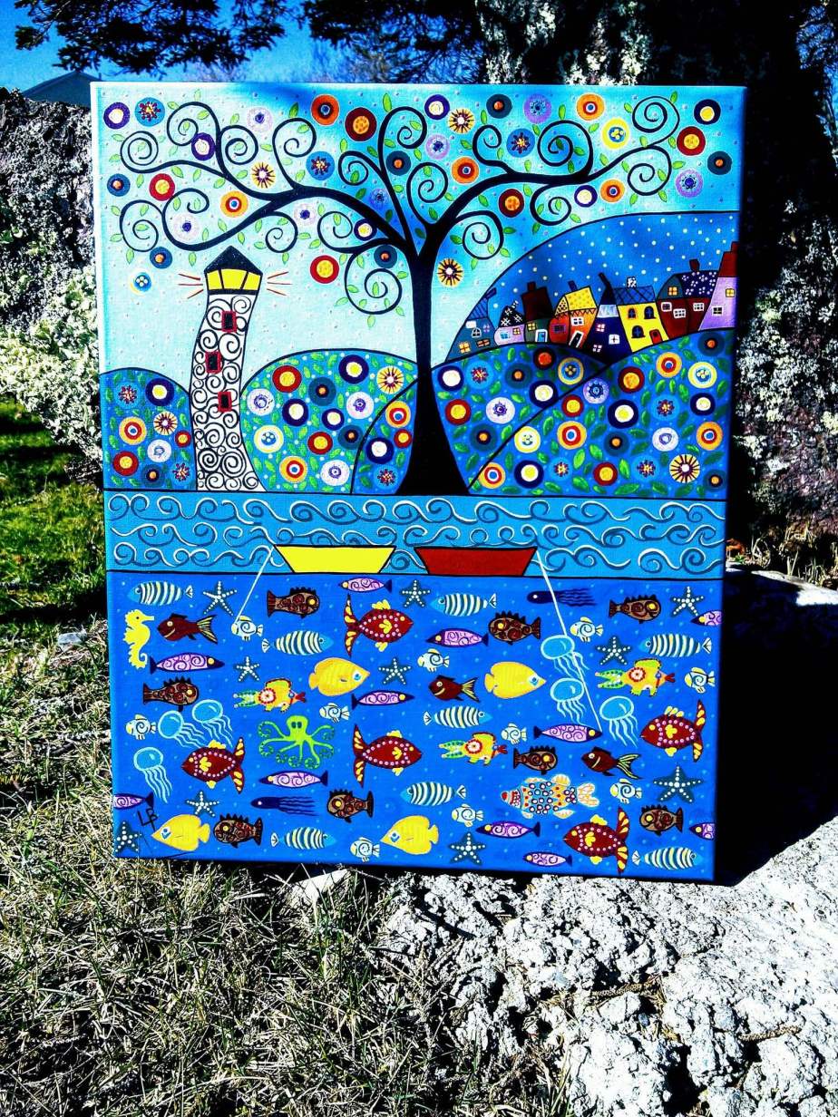 My love of Nova Scotia was the main inspiration behind this painting. I wanted to paint something that had a fun and whimsical feel to it with lots of bright colours. Since Nova Scotia is made-up of many small villages, lots of fishing communities and lighthouses, it was easy to represent them in my art. I also wanted to put lots of different fish so every time you looked you might see something you missed the time before. I hope this brings you many hours of enjoyment!
